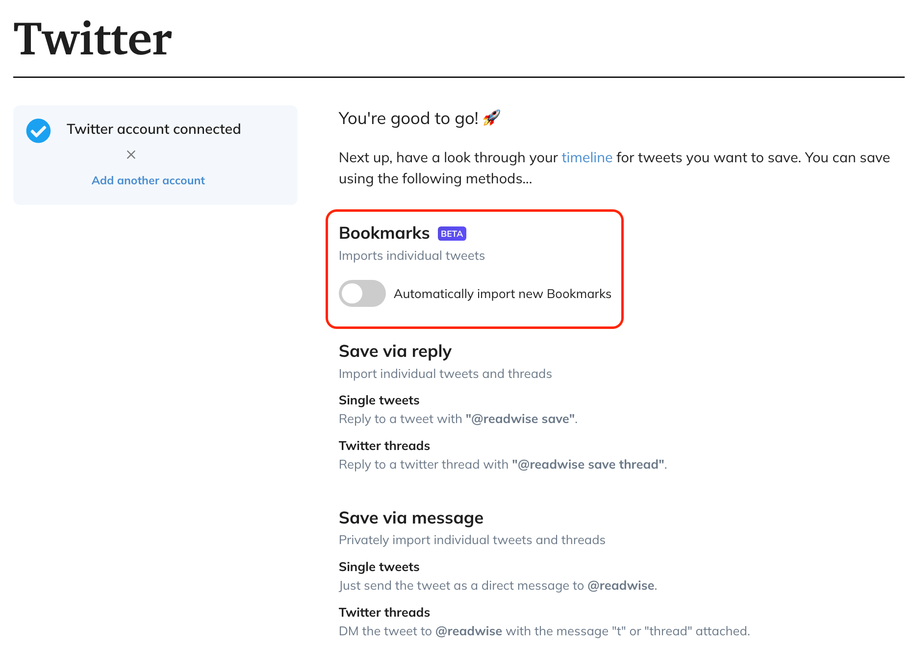 Bring your Twitter bookmarks into Readwise so the ideas you save there show up where you can review them with your other highlights. Once you turn it on under the Twitter syncing page, anything you bookmark going forward will be imported. If you want to bring in older bookmarks, sending them by DM to @readwise works well and avoids Twitter’s daily re-bookmark limit. Choose the route that saves you time and effort.
