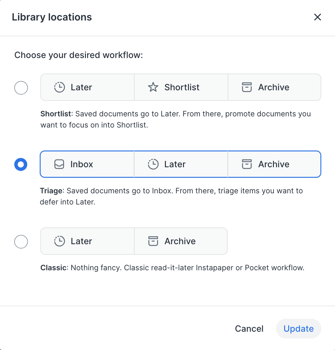 Library configuration lets you choose how much structure you want around your reading. The Triage configuration is the default and it sends things to Inbox so you can decide what deserves attention now versus later. With Shortlist, you save freely and only move items forward when they truly matter. Finally, Classic is for those who want a single place to keep things without extra steps.