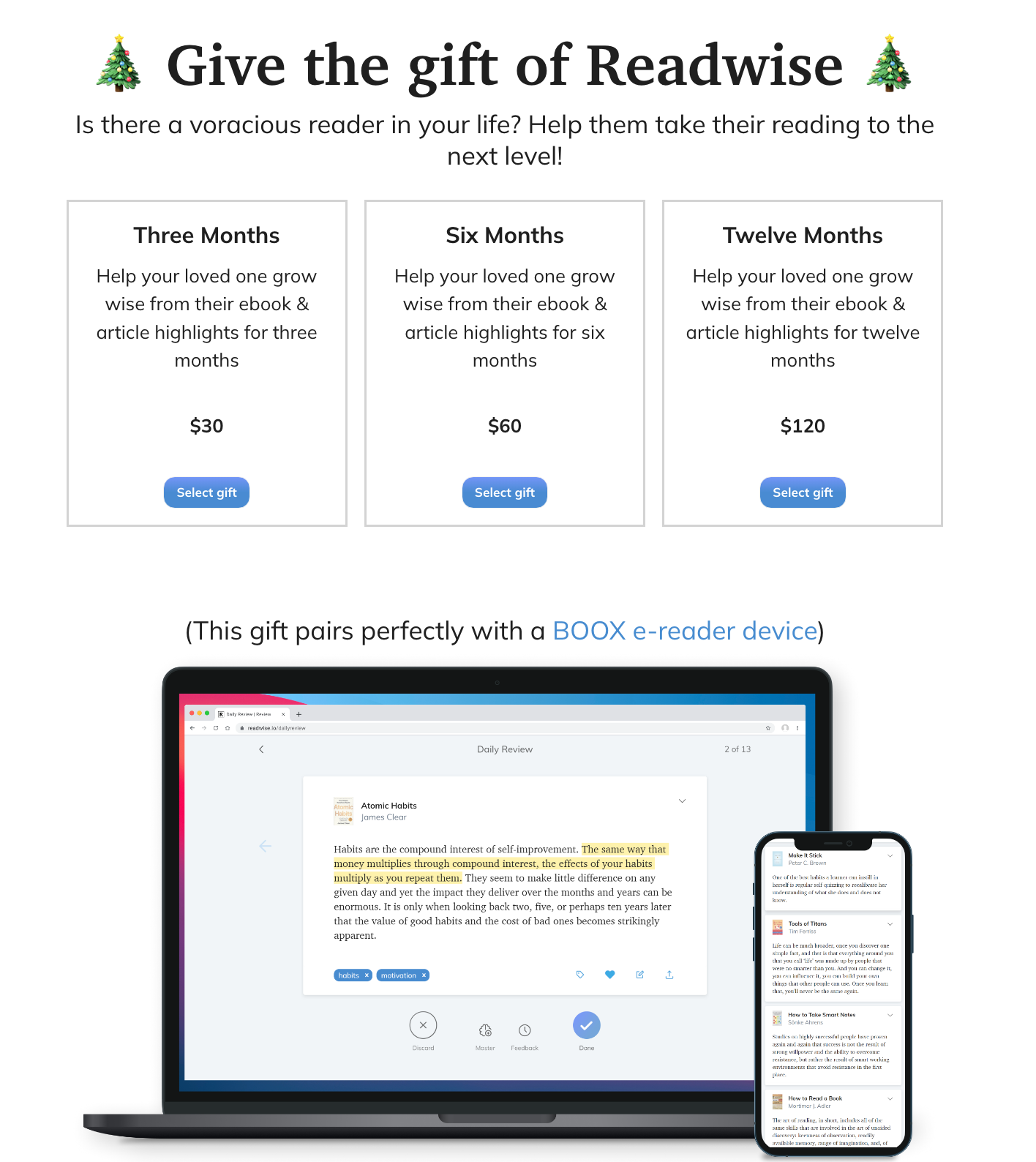 A Readwise subscription supports a “read more” goal by reminding you of what you have already read and liked. Each day, it revisits highlighted passages from books and articles in one place. Gift options are available for 3, 6, or 12 months.