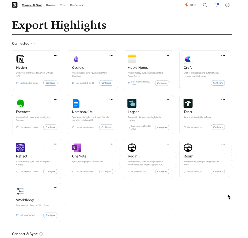 You can get a daily text message with a random highlight from your reading. This works by using webhooks, which let Readwise send updates to other tools as events happen. Zapier sets this up for you when you create a workflow that sends one random highlight each day. Custom webhooks are available if you want those updates sent straight to your own setup instead. You can setup a webhook from the Export page > Webhooks.