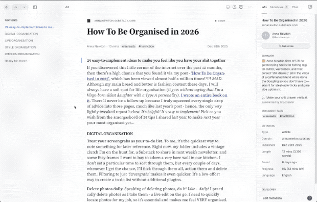 Reading on a smaller screen or just want fewer distractions? This week’s documentation shows how to quickly hide the left and right side panels on web via mouse, keyboard, or even by default in your preferences. Learn the shortcuts and settings that give your reading a bit more elbow room.