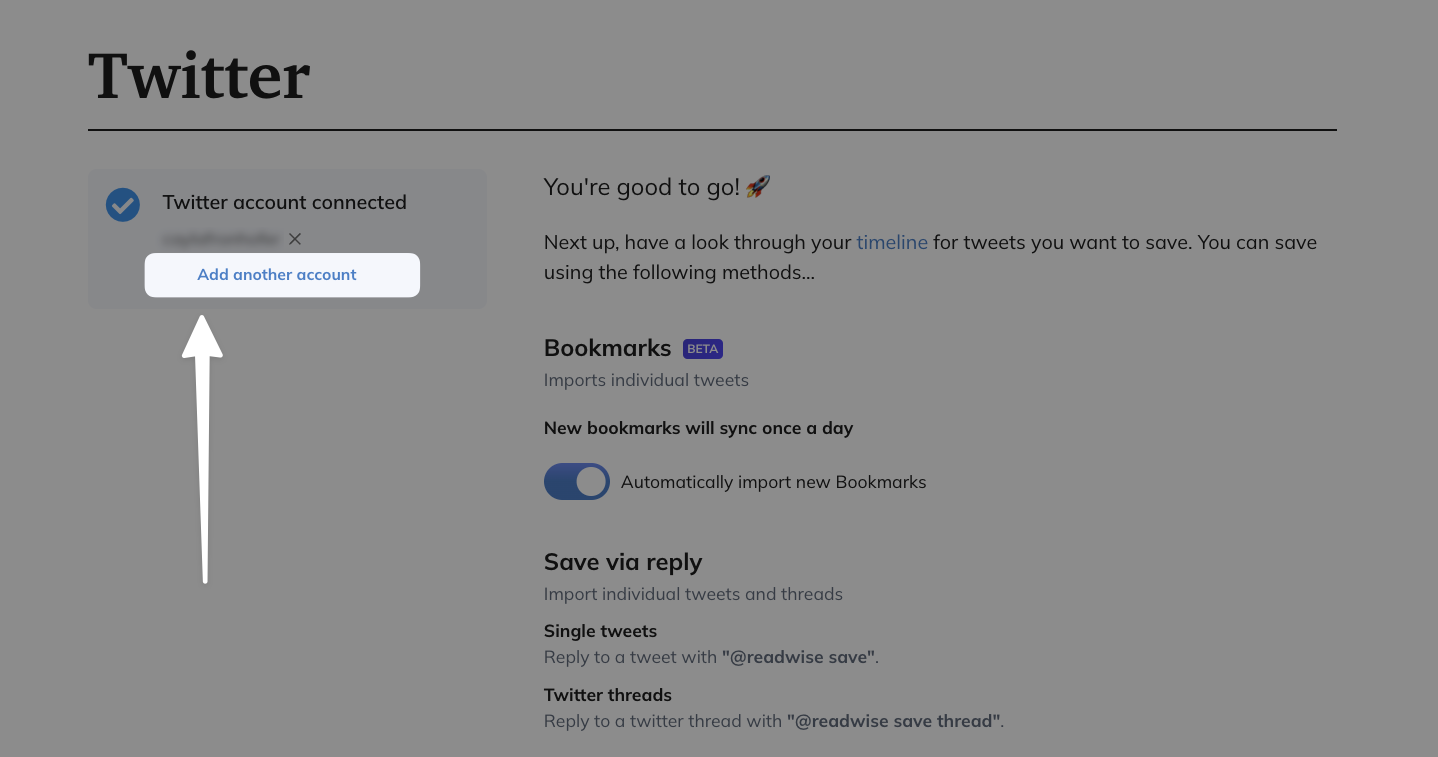 You can connect multiple Twitter accounts from the Twitter/X settings page so everything flows into Readwise together. On the left side, you’ll see which accounts are already connected. Just click “Add another account” whenever you want to include one more.