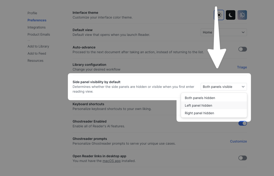 Open documents with fewer distractions and more room to read comfortably. In your account preferences, you can decide whether the left panel, right panel, or both stay hidden by default. This setting remembers your preference each time you come back. It’s a nice way to make your reading space feel more tailored to you.