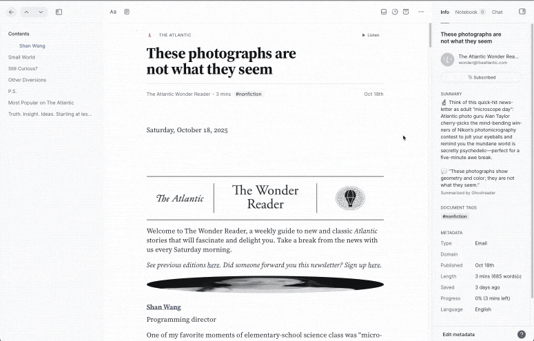 🛜 Parsing Updates — Krzys improved how Reader handles posts from espn.com, epsilontheory.com, linikedin.com, theinitium.com, spectrum.iee.org, techcrunch.com, bloomberg.com, royalroad.com, newyorker.com, reddit.com, chrzaszcz.dev, maggieappleton.com, france24.com, huxiu.com, science.org, and heise.de. Reading times and word counts for the New York Times should also be more accurate now.