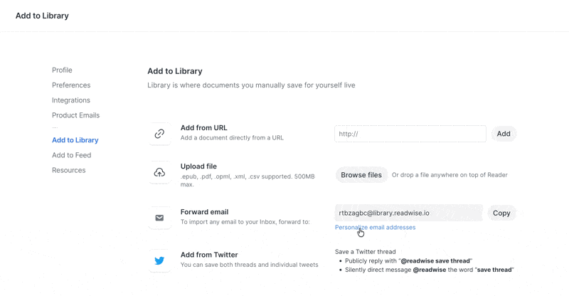 This feature helps you remember your Reader email address and keep your reading organized. You can pick a personalized address by visiting the Add to Library settings in the Reader web and desktop app, or Account then Email on your phone. The address needs to be unique to you, like a license plate. Choosing something very obvious can attract spam, so a bit of randomness helps.