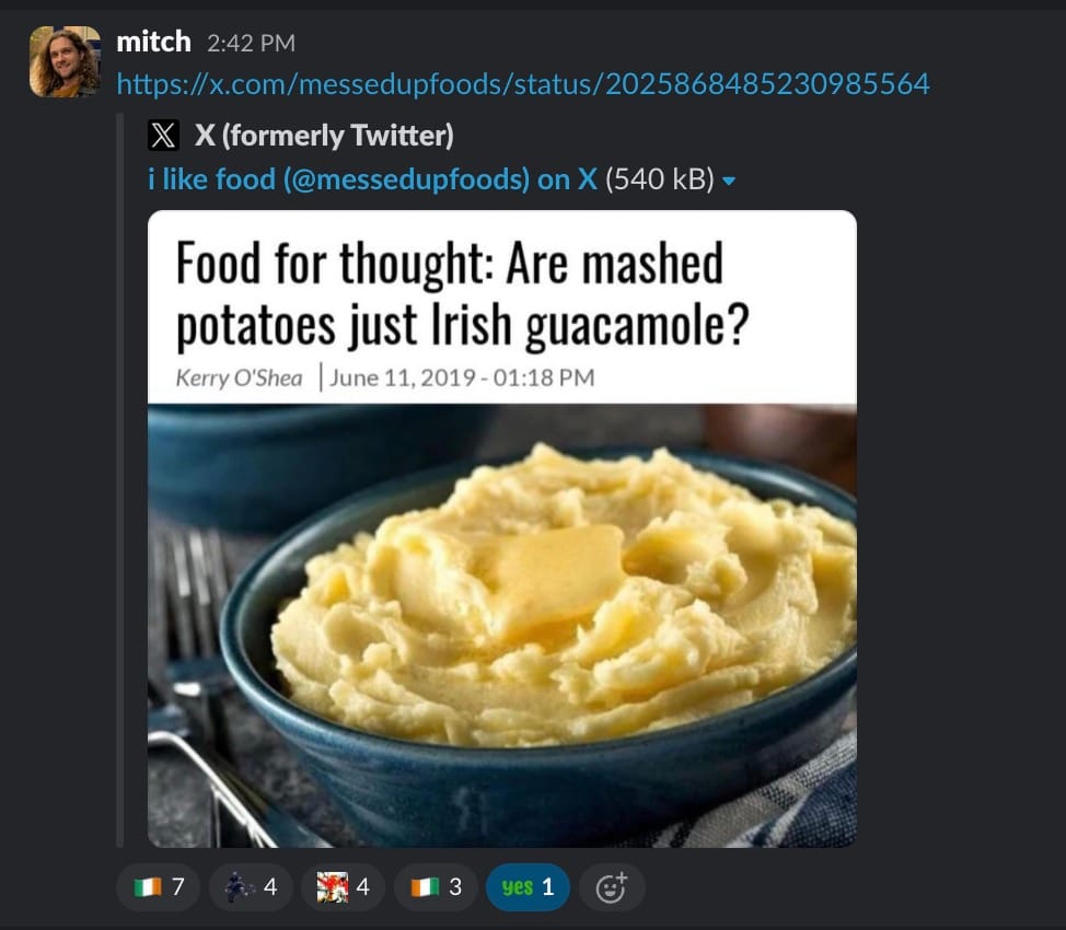 Here comes Mitchi with another banger... or should I say "mash"? There's nothing like a food debate to get me going. In this case, though, the agreement is unanimous. Now, would you prefer nachos or a bag of Tayto for your Irish guac?