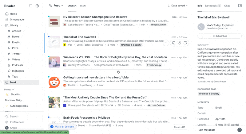 🛜 Parsing Updates — Krzys improved how Reader handles Twitter/X content. Krzys also fixed a bug where email newsletters containing embedded script tags were getting cut off mid-content. Newsletters from Dan Koe, Liberty's Highlights, and various Substack authors were among those affected. Full newsletters should now come through intact.